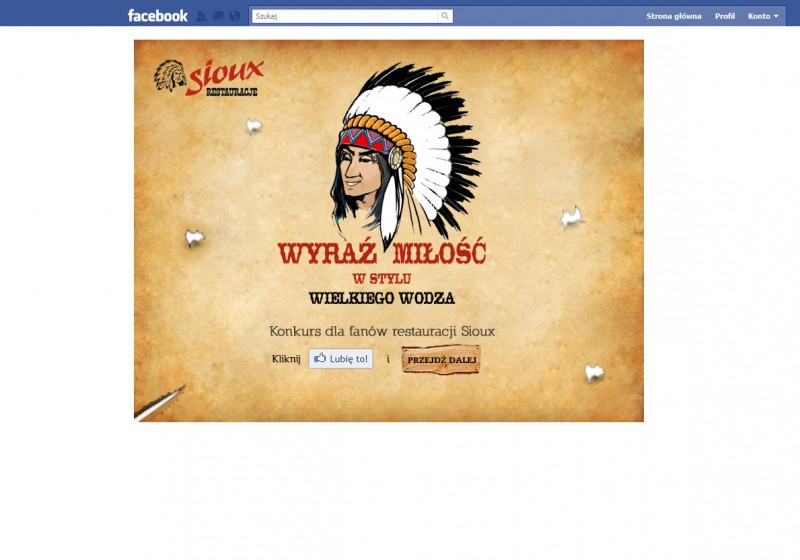 Równolegle z działaniami prowadzonymi w restauracjach SIOUX, na portalu społecznościowym Facebook.com ruszył konkurs pod hasłem „Wyraź miłość w stylu Wielkiego Wodza”. Akcja trwa od 10 do 28 lutego br. By walczyć o nagrody, należy spełnić kilka warunków: